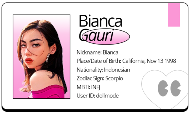 Every pages of story has its main lead, spelling the written tale into something beyond endearing, something that could capture the eyes of every poet; Meet, Bianca Gauri, the epitome of flawlessness, where only the sweetest beauty flows through the veins of her entirety. Born and raised in the town called San Francisco, California, precisely at 13th of November, by the year of 1998. Bianca is the first born daughter with bloods of Chinese, American and Indonesian. Right now, she's currently dwelling in the field of entertaiment as an artist, chasing that fame where she could bewitch everyone. Her hobby remains having her nose stuck in those pilled up books she loves so much, or in other words, she loves reading! Other than that, she also loves watching movies, where she has romance and animation as her most beloved genre. Although the fragments of flawlessness are inching closer to her divinity, where she becomes the vivid depiction of ethereal beauty, she often feels the only one crawling beneath these realm, she feels alone, sometimes, like breathing amongst the scattered meadow by herself. Without her acknowledgment, there lots of people who warmly loves her as she is, where they would sacrifice everything for Bianca Gauri. As days passed, Bianca also blooms her adoration towards flowers, where each petals becomes something as softly sacred as written poetry.