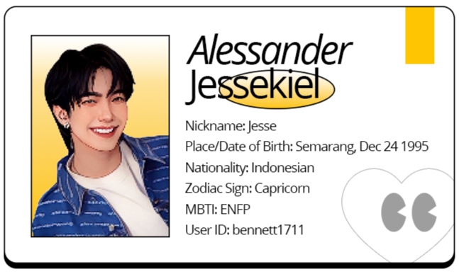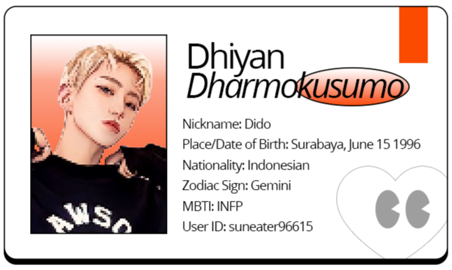 The world is his oyster. It has always been, since 15th June 1996, the day when he was born in Surabaya. The man never let anyone took over his world as he wanted to live his life like how he wished it to be. He went by the name of Dhiyan Dharmokusumo, better known as Dido for his surroundings. From siblings of four, he was the last child of his family. As he stepped at the 2nd grade of Elementary School, he moved to Sidoarjo and spent his entire childhood there until he graduated from Senior High School.All of his older siblings are female, however, with huge age gaps from Dido. That was one of the factors why he grew up as a childish and stubborn little kid, getting through his childhood days with attentions poured all onto him. People often labeled him as the selfish and egoistic one, but that certain trait of him slowly getting lessened after he progressed on moving to Jakarta. He grew up to be a man of his words and strong ambitions. Institut Kesenian Jakarta was the university he pursued. It was not a big surprise coming from him when he chose Dance as his major, for his family has been long dabbling in art and dancing. After he graduated from his university, Dido became a professional dance choreographer.Artsy, he is. Art felt like a water that easily flows through his veins. His body instantly created beautiful, lyrical movements when the melodies started to fill in the room. It was easy for him to work at things with art involved in it. As a hardworker, he always strived his best on doing art. Anything he wished, he would do his best to grant it. The man was also quite vocal upon showing out his opinions, but quite reserved upon showing out his interest. Dido hated tomato and enjoyed reading shoujo comics but he did not wish many people to know, since he did not like getting picked on because of it.